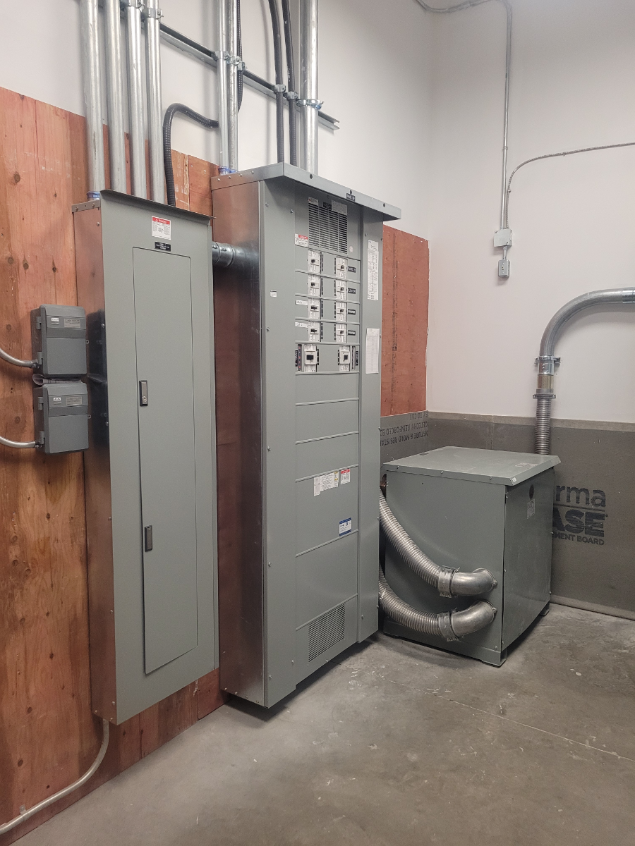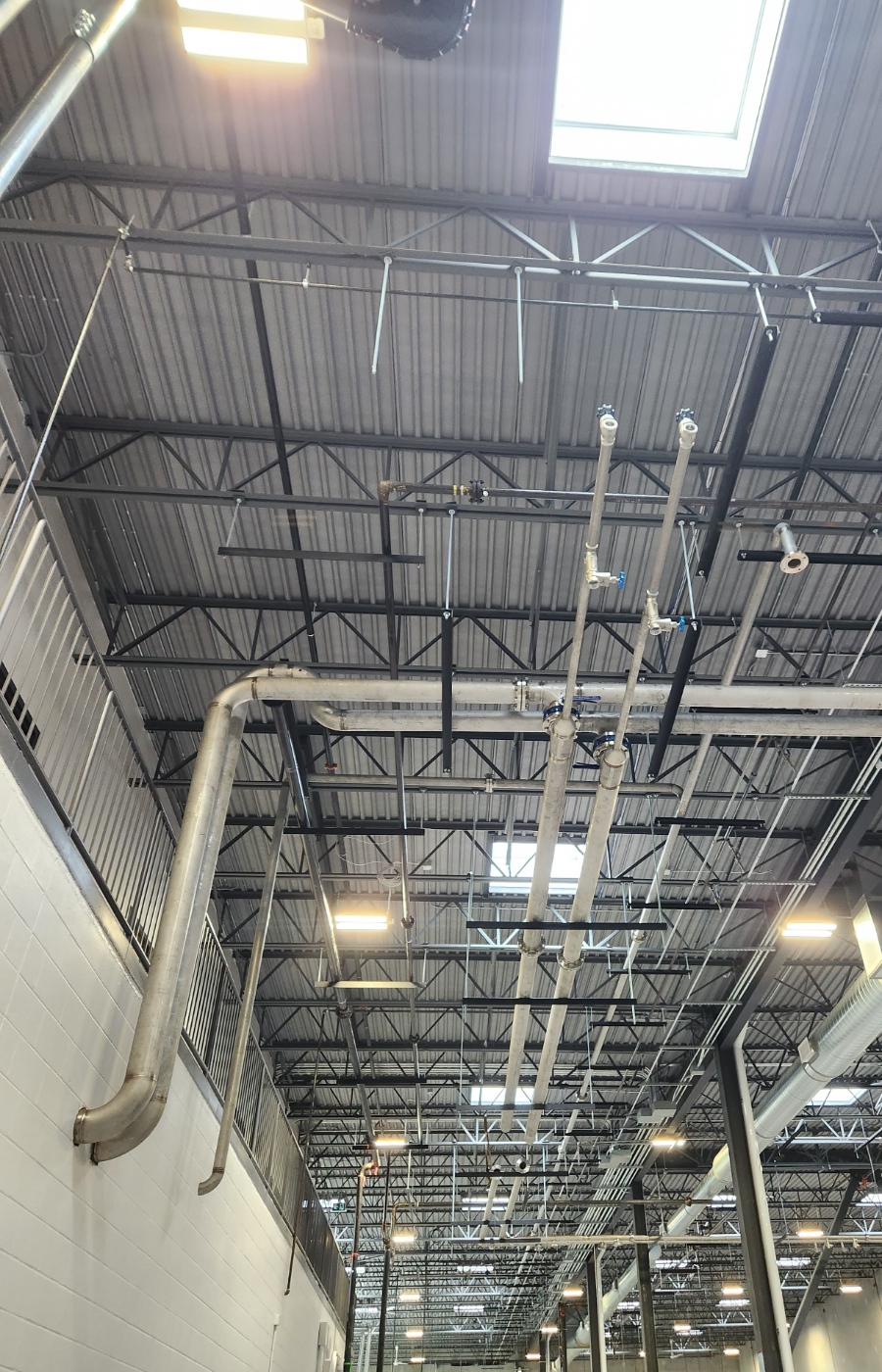 Brewery/taproom fit-up with process power, distribution for brew systems, public tasting areas, lighting and controls.